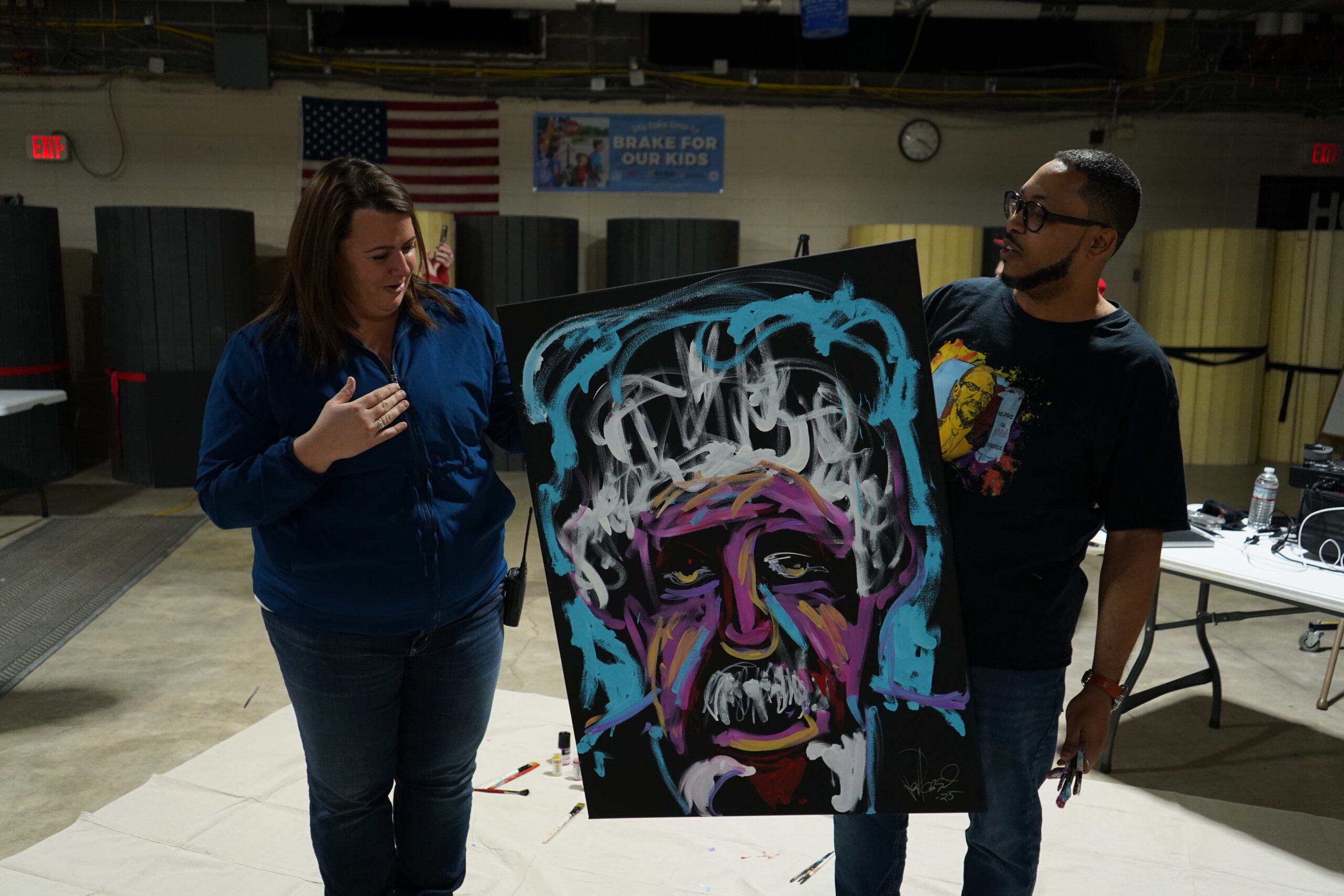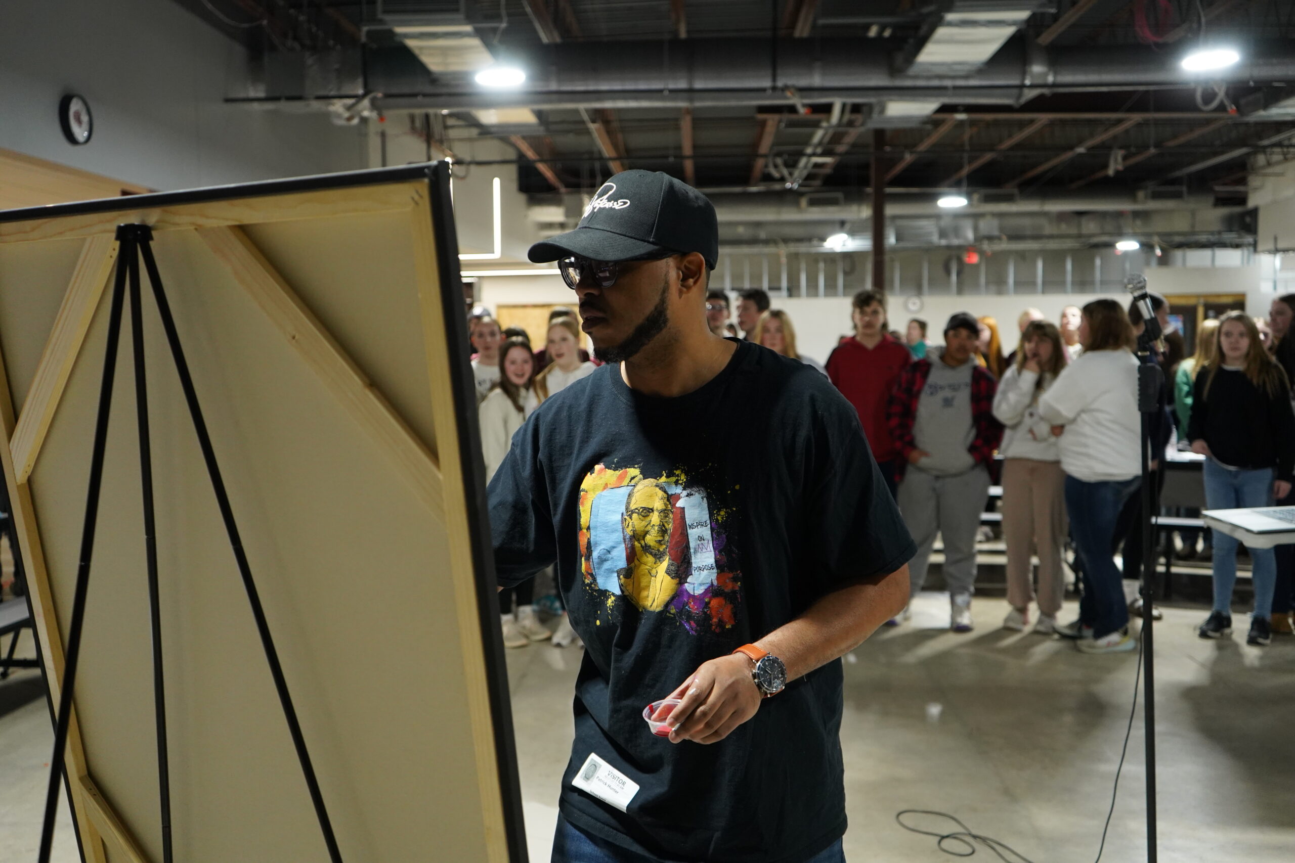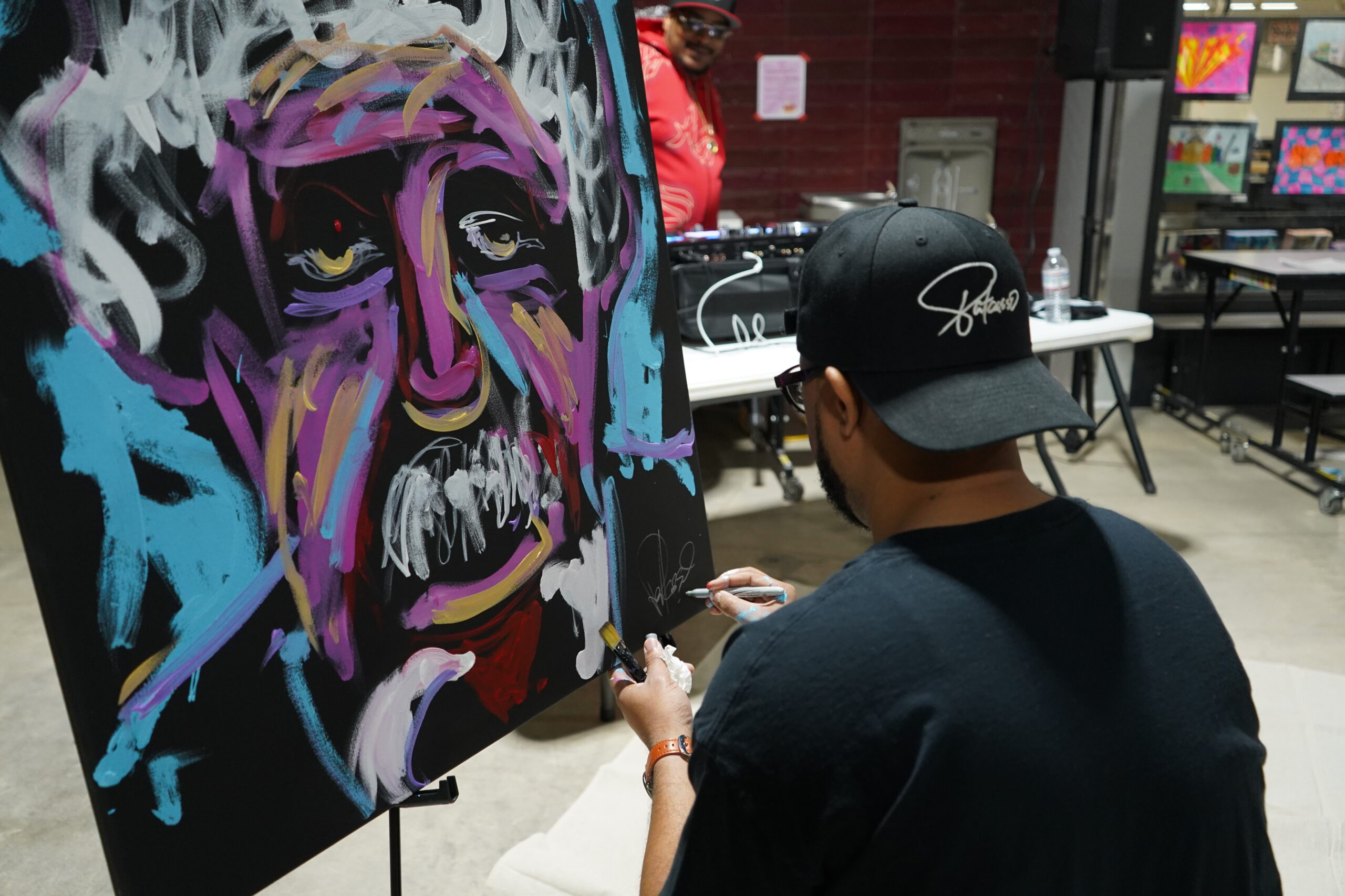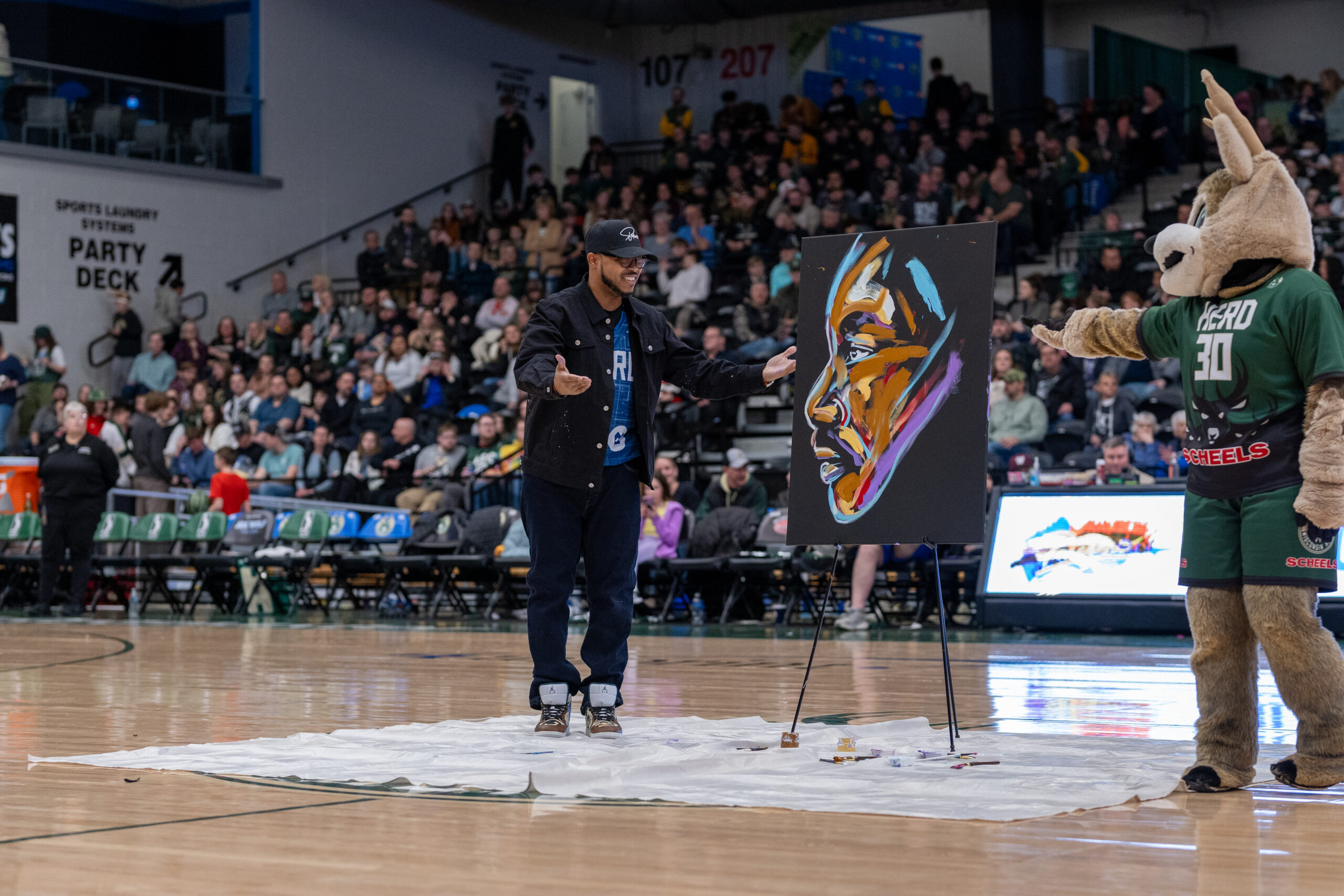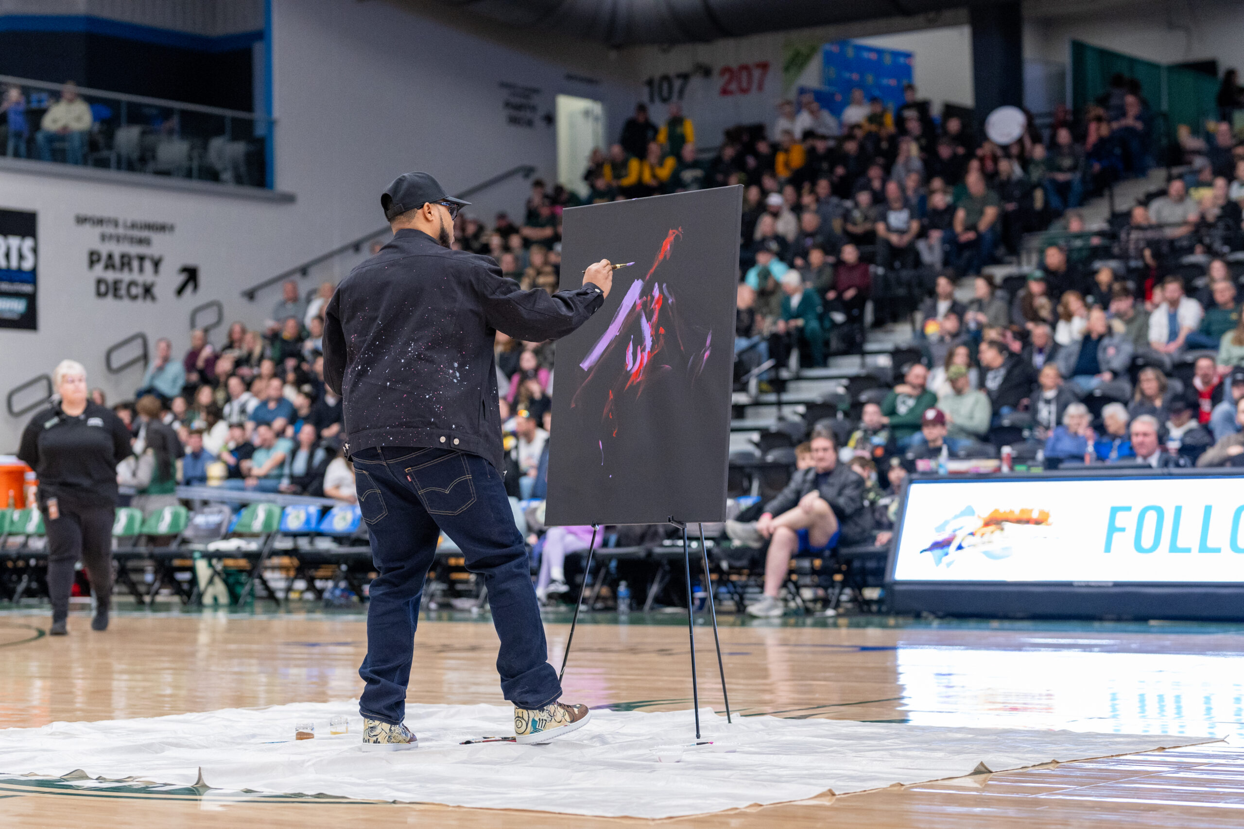 Patrick "Patcasso" Hunter painting upside down during halftime