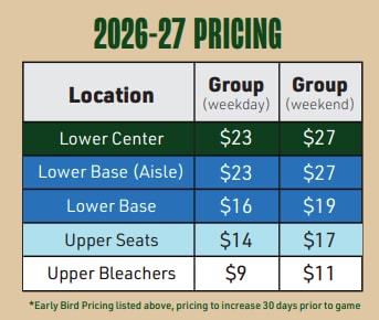 *Early Bird pricing listed above, prices increase 30 days prior to game.