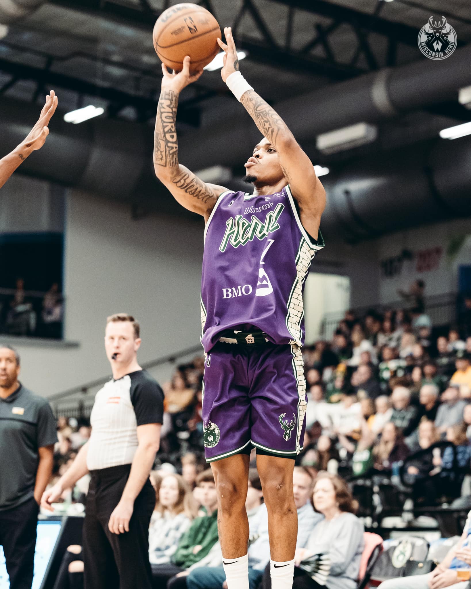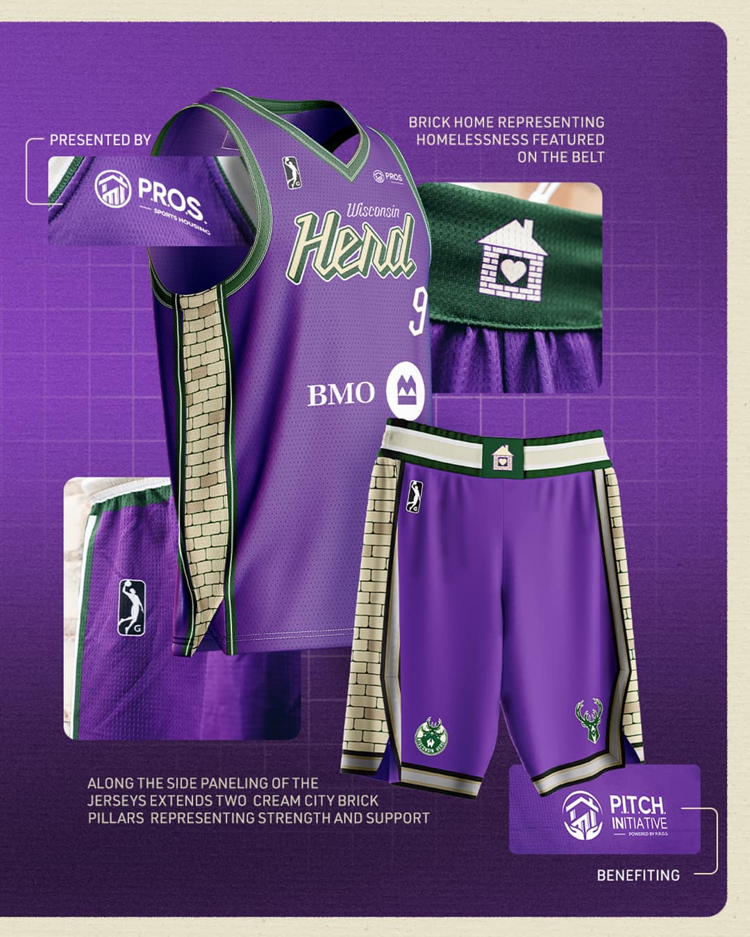 The Herd returned the homelessness awareness theme jerseys for a second season to raise money for the P.I.T.C.H. Initiative. The jerseys once again paid homage to the Milwaukee Bucks’ 2019-20 City Edition jersey with the wordmark as well as Cream City Brick along the side of the jerseys. The bricks are placed in two panels to represent the two pillars of strength and support. The overall jersey top and shorts feature purple, the color of Homelessness Awareness.