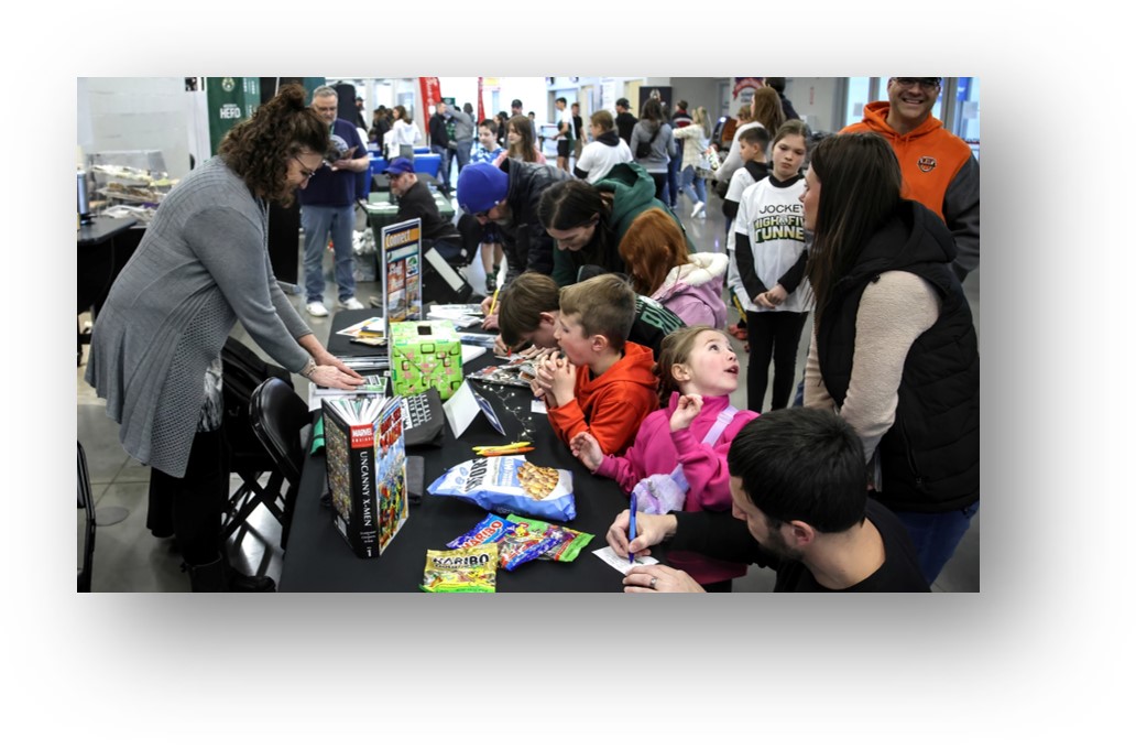 The Wisconsin Herd and Winnebago County worked with all five libraries in the County (Oshkosh, Neenah, Menasha, Omro, Winneconne) to host a winter reading program in tandem with the Herd's Marvel Theme Night. The reading program included Herd-branded prizes like bookmarks, drawstring bags, hacky sacks, tickets to the Herd’s Marvel game, and signed Marvel comics and posters to encourage children to read. Wisconsin Herd players and Pointer made appearances at each library to read with kids in the program. At the Herd Marvel game in March, libraries were in attendance so kids and adults could sign up for a library reading card right at the game. The Marvel jerseys worn that night also featured the five Winnebago County libraries on the neckline.